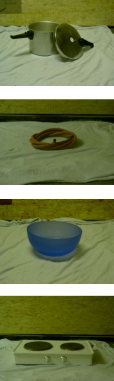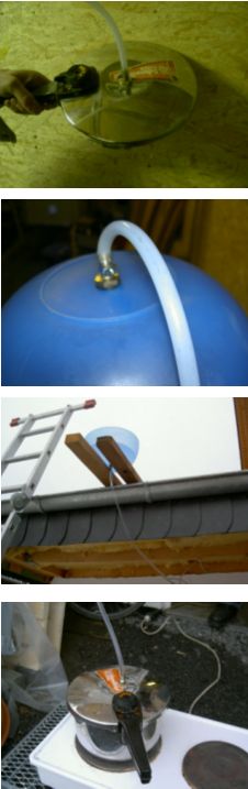 Wir haben den Schlauch mit einer Art Ventil an der Öffnung des Deckels des Drucktopfes angeschlossen (Bild 1). Der Kochtopf ist druckdicht verschlossen. Das andere Ende des Schlauches führt von unten in die Salatschüssel (Bild 2). Der Drucktopf steht auf einer handelsüblichen Kochplatte, die das Wasser später erhitzen soll (Bild 4). Die Salatschüssel steht auf einem Gerüst aus Dachlatten (Bild 3), etwa 2m über dem Topf.